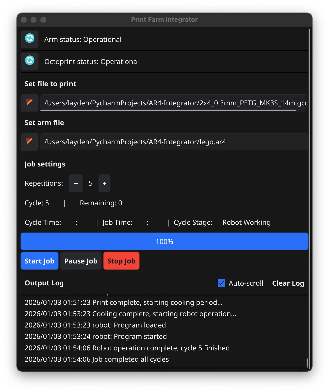 The GUI is made of four panels, The first manages the interfaces to the robot and Octoprint. The second manages the .ar4 and .gcode files being sent to the robot and printer respectively. The third panel lets the user set how many times the programs should run as well as job status and controls like start, stop, pause. Finally, the last panel shows an auto-scrolling log of the program output.