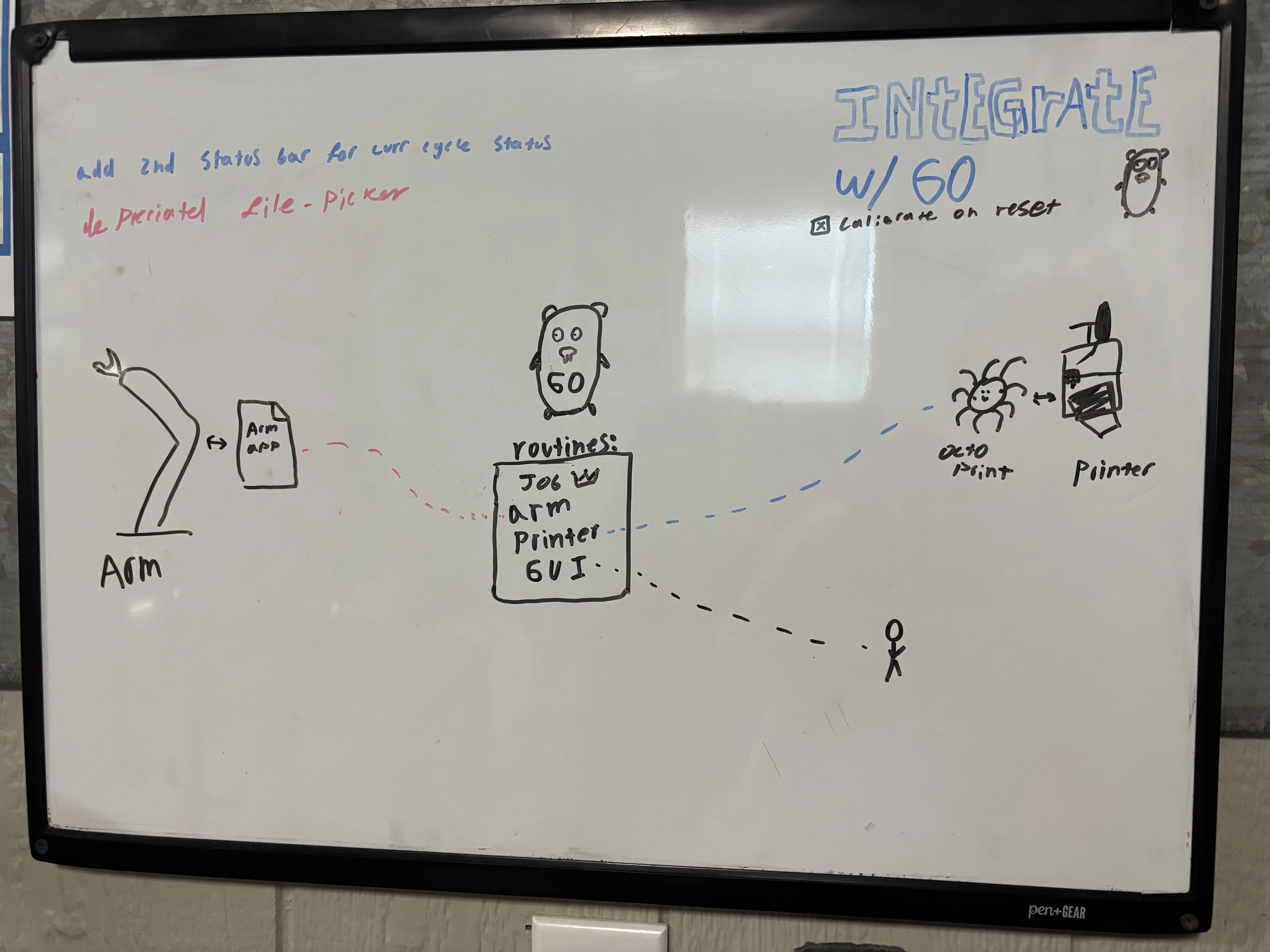 The software I created spawns three Goroutines (threads) that handle the various components simultaneously and communicate through channels. There are handlers for the printer, robot, and job queuing; then the original thread handles the GUI. The Job handler runs a ticker that cycles a control loop every 100ms. The control loop reads the state channels to determine the next step in the cycle and dispatches commands to the machine handlers and GUI. Each of the machine handlers essentially is a wrapper for its respective API. They are separated into modules for readability since making all of those requests can get lengthy. The machine handlers are also responsible for detecting, starting, stopping, restarting the external software, including OctoPrint and the AR4 control.