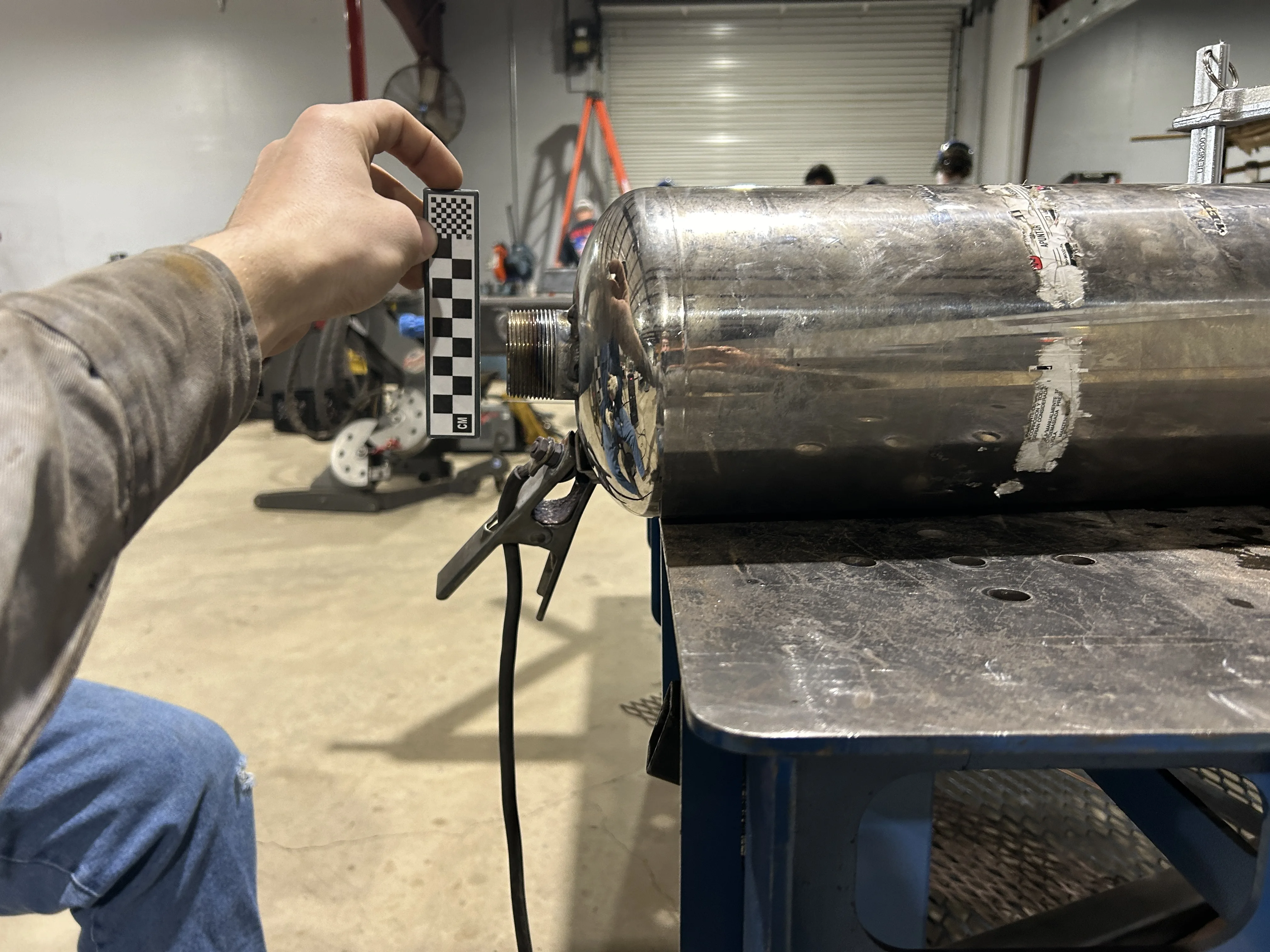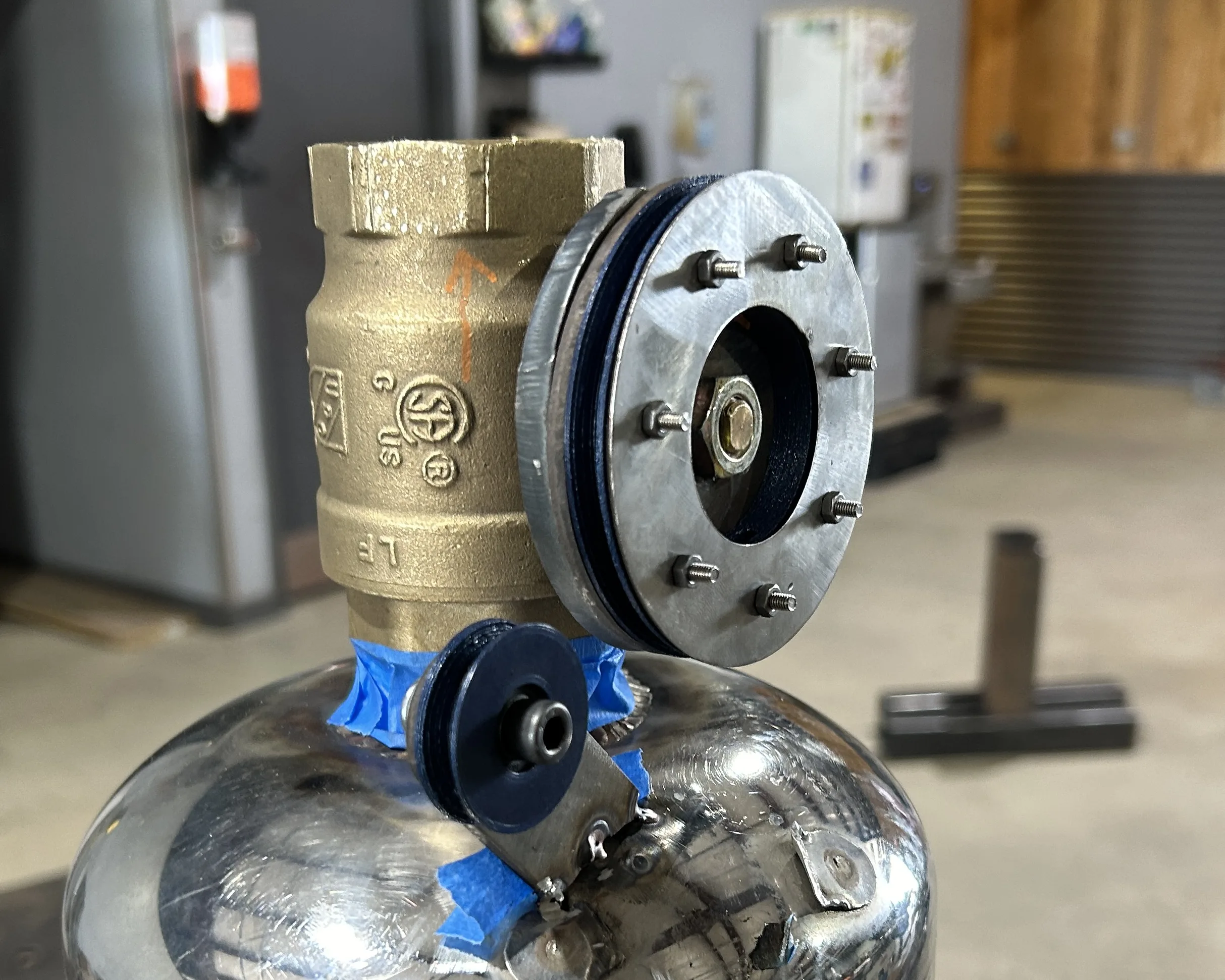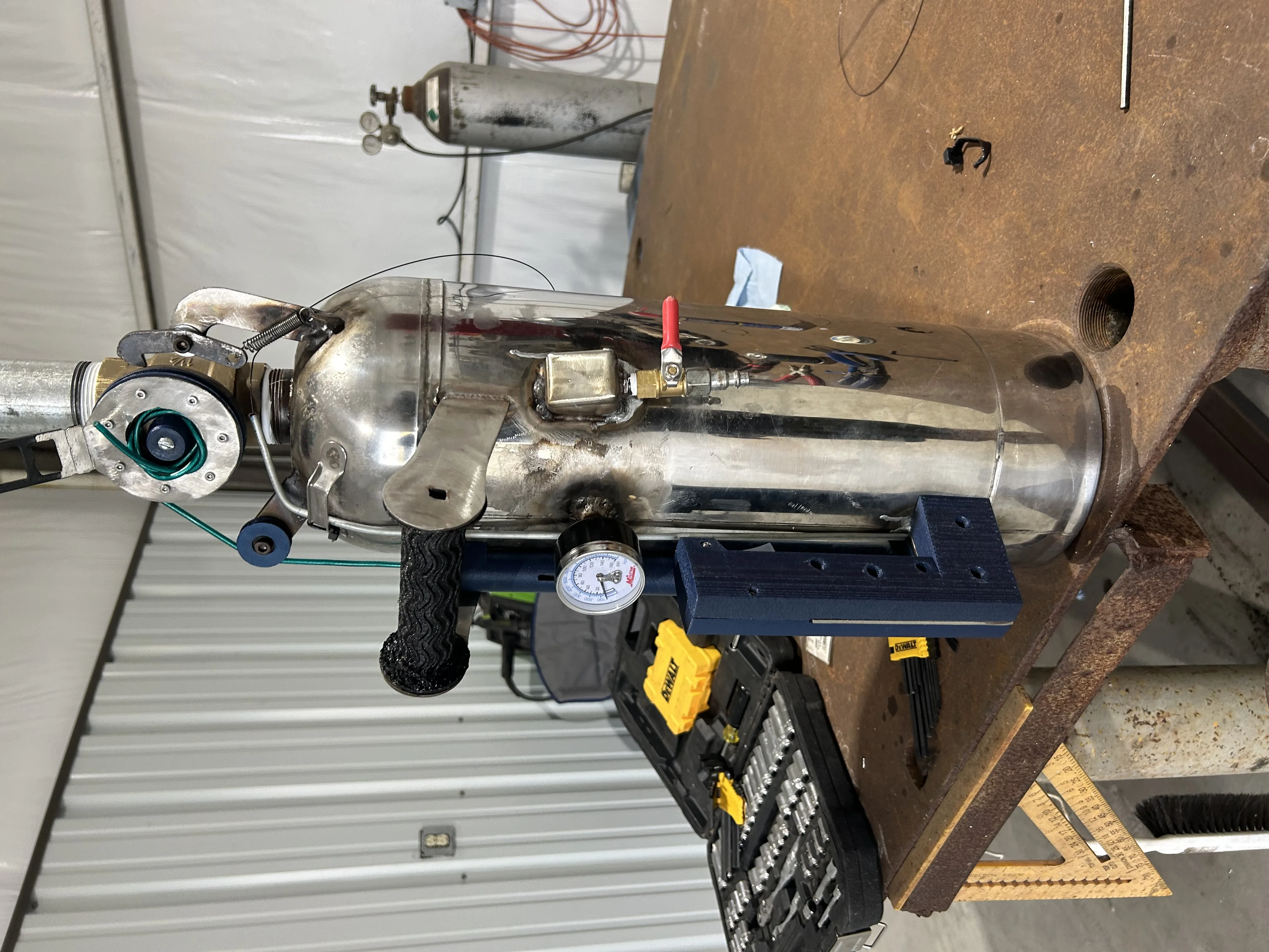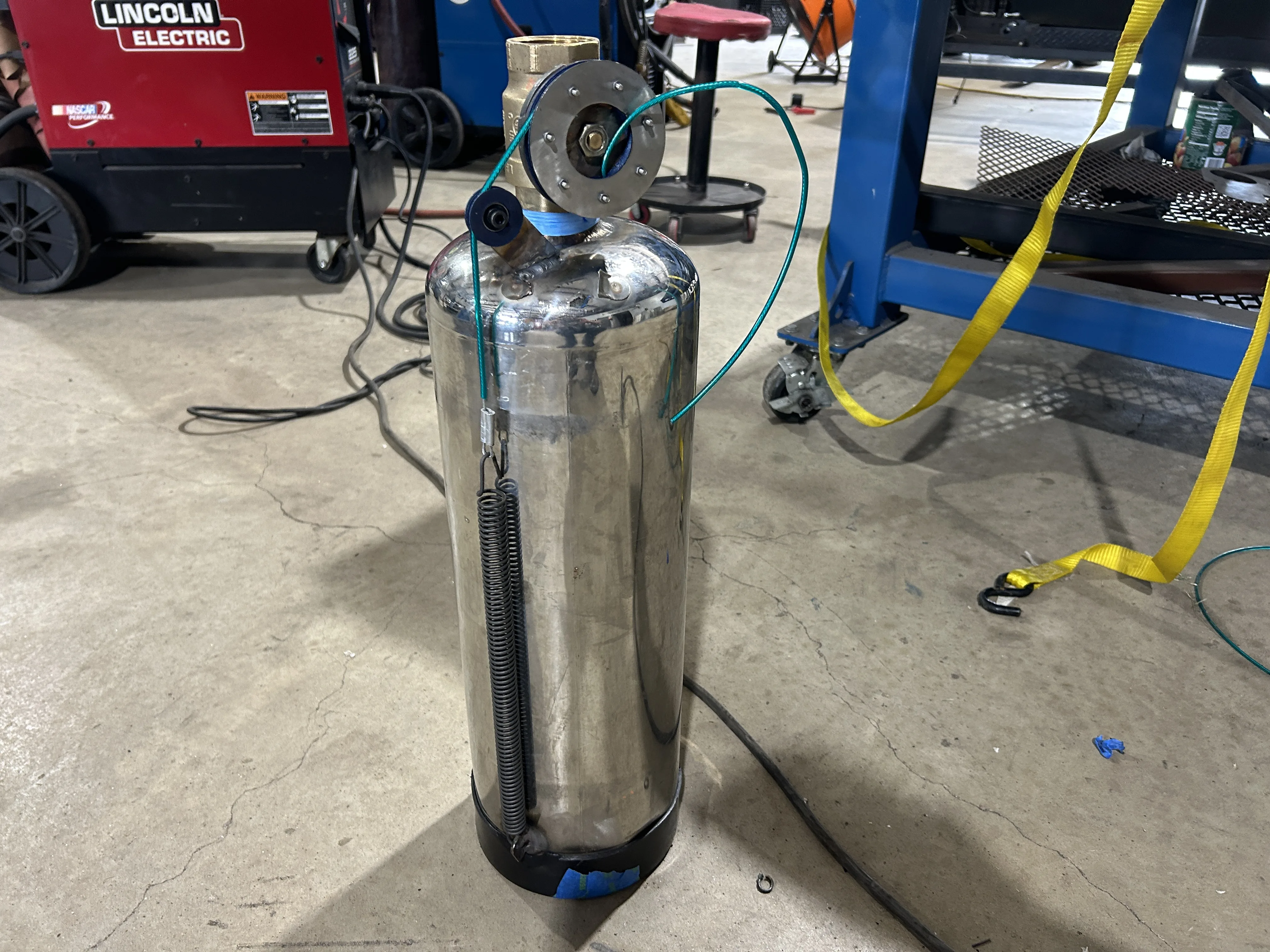 The body is a stainless steel fire extinguisher, then most of the components attached to it are various-sized sheet metal pieces cut on a CNC plasma table and welded to it. Truth be told, I did none of the welding on this project, I had a friend do it for me. The metal on the tank is super thin, and becoming good enough to do the welding for this project was not in the timeframe. Even with a good welder, there were issues getting a perfect seal at some joints. I used Por 15 Fuel Tank Sealer to coat the inside of the tank, which worked well.